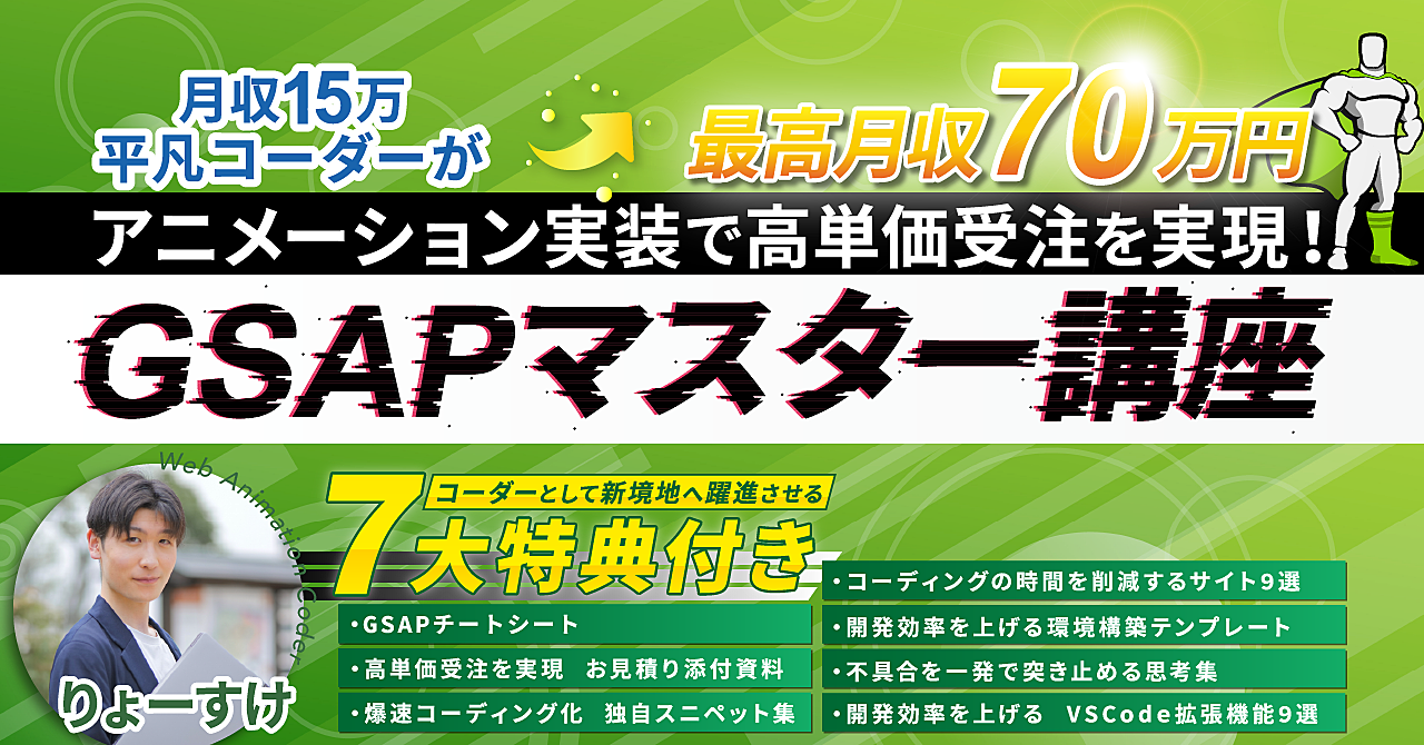 りょーすけさんの「【たった”10日間”でWEBアニメーション実装スキル習得】GSAPマスター講座」です。